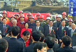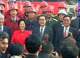 三峽工程導(dǎo)流明渠截流今天上午合龍成功。截流儀式結(jié)束后,中共中央政治局常委、全國(guó)人大常委會(huì)委員長(zhǎng)李鵬,中共中央政治局委員、國(guó)務(wù)院副總理吳邦國(guó),全國(guó)人大常委會(huì)副委員長(zhǎng)鄒家華等中央領(lǐng)導(dǎo)離開(kāi)主席臺(tái),到上游圍堰接見(jiàn)三峽建設(shè)者。