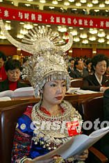 來(lái)自貴州少數(shù)民族地區(qū)的黨員代表身著獨(dú)特的銀飾,盛裝出席中共十六大。作者:毛建軍
