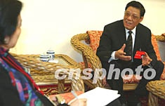 中共十六大代表、山東大學(xué)校長展?jié)战邮芡鈬浾咴L問,談高等教育改革與建設(shè)問題。作者:毛建軍