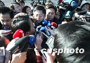 等候在北京人民大會(huì)堂外的中外記者們,十四日拼命擁擠,抓緊采訪出席中共十六大閉幕會(huì)的代表。作者:毛建軍