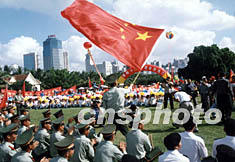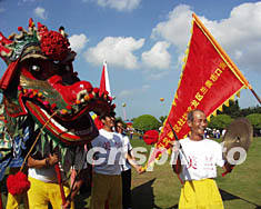 海口市六萬市民十四日在萬綠園慶祝集會,?诿捞m區(qū)龍文坊社區(qū)的六十歲老者舞動珍藏八十年的彩龍,歡慶中共十六大閉幕。作者:王辛莉