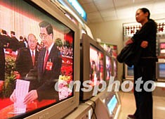 中共十六大十一月十四日在北京閉幕,市民在商場觀看胡錦濤投票的電視新聞。作者:張宇