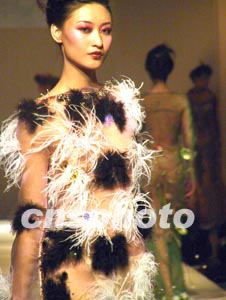 新古典主義·璞玉.甘曉川2003春夏時裝發(fā)布會,二十四日晚在北京中國大飯店舉行,其服裝設計融合古今,體現(xiàn)出大膽前衛(wèi)的設計理念。圖為一款色彩艷麗的透視裝。作者:盛佳鵬