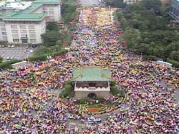 示威游行的宣傳車(chē)播送著《天黑黑》﹑《補(bǔ)破網(wǎng)》等歌曲﹐以及“阿公要煮咸﹐阿扁要煮淡”的歌聲﹐令年邁的示威者聽(tīng)了格外傷感。