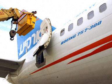 機(jī)場工作人員在檢查波音757客機(jī)有無受損