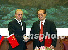 中國國家主席江澤民與俄羅斯總統(tǒng)普京二日在北京人民大會(huì)堂共同簽署中俄聯(lián)合聲明。作者:毛建軍