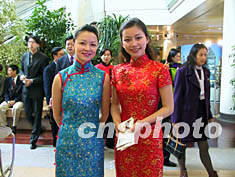 十二月三日,靚麗的中國申博形象大使袁鳴(左)和丁曉軍身著民族服裝出現(xiàn)在摩納哥國際展覽局會(huì)議場館內(nèi),引來很多關(guān)注的目光。作者:崔煜芳