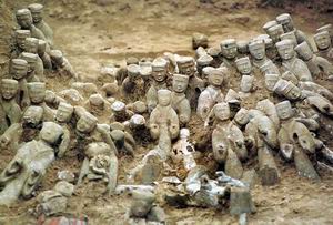 在長9.7米、寬1.9米的陪葬坑內(nèi),展現(xiàn)在世人眼前的是距今二千多年前的漢代王侯貴族車馬出行時的豪華陣容,只見最前一排是五匹陶制的高頭大馬,馬身上都騎著神態(tài)各異、栩栩如生的陶俑。