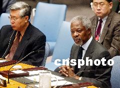 12月10日,聯(lián)合國安理會就伊拉克遞交的長達萬余頁的報告召開公開討論會議。圖為中國常駐聯(lián)合國大使王英凡(左)和聯(lián)合國秘書長科菲·安南在會議上。Ic/cnsphoto 攝
