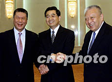 應記者的要求,胡錦濤兩手交叉,同時握住董建華和何厚鏵的手,高興地留下了難得的合影。
