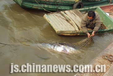 據(jù)介紹,白鱘是漁民孫永來昨天下午二時左右在長江下關(guān)潛洲以北的江面上捕捉到的。孫永來花費一個多小時將白鱘拖運到一千五百米處的漁政碼頭。