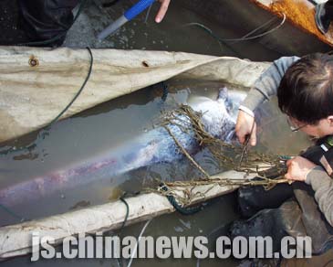 專家介紹說:這條白鱘傷勢嚴重,可能暫時去不了武漢,必須就地搶救。