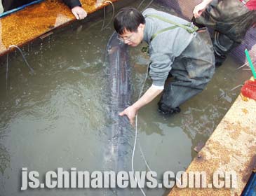 南京漁民捕到特大珍稀動(dòng)物白鱘 可能送武漢搶救 (2002-12-12 09:38:10)