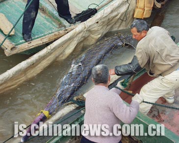 中新網(wǎng)南京12月12日電(記者陳光明 丁東升)冬日下的長江江面依然是寒風(fēng)凜冽。南京下關(guān)漁政碼頭的江岸邊,今天上午站滿了翹首遠(yuǎn)望的市民——他們關(guān)切和憂慮的目光投向江邊一艘漁船邊掛著的魚網(wǎng)里邊的“國寶”級動物——白鱘。這是漁民孫永來昨天下午二時左右在長江下關(guān)潛洲以北的江面上捕捉到的。