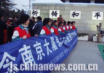 鳴響警報(bào)的主會(huì)場(chǎng)位于南京江東門侵華日軍南京大屠殺遇難同胞紀(jì)念館。江蘇省和南京市黨、政、軍及各界人士三千多人在這里隆重舉行“悼念南京大屠殺三十萬(wàn)同胞遇難六十五周年儀式暨南京國(guó)際和平集會(huì)”。隨著低沉的警報(bào)聲,人們低首默哀三分鐘,緬懷六十五年前遇難的同胞。