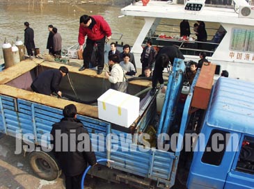 珍稀白鱘在南京出水后,因傷勢嚴(yán)重,不能長途跋涉,原向西運(yùn)到武漢的計(jì)劃改成向東轉(zhuǎn)往昆山。這里有江蘇最好的養(yǎng)護(hù)白鱘的條件。昨晚十一點(diǎn)五十分左右,白鱘安全運(yùn)抵江蘇昆山,救護(hù)專家們也隨車同行,對白鱘進(jìn)行治療。
