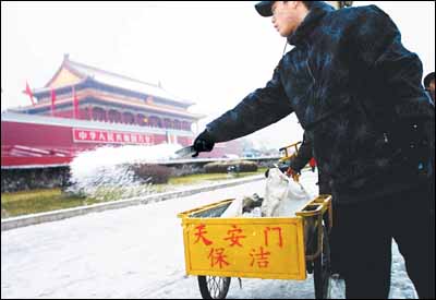 從上午剛開始下雪時,大街小巷就有許多掃雪的人,沒有責(zé)任區(qū)的公共地段也有不少群眾自發(fā)清掃。許多商家動員職工手中拿著掃帚和鐵鏟,裝備相當(dāng)完善。一些城管大隊的便民服務(wù)執(zhí)法車上則裝備了拖車?yán)K、鐵锨等工具,以應(yīng)對緊急情況。(李健)