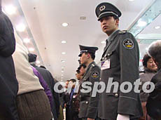 十九日是北京黃金產(chǎn)品正式銷售的第二天,仍有大批市民冒雪前往購買金條。由于人太多,商場保安層層護衛(wèi)購金隊伍。作者:王麗南