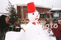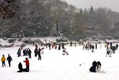 上午11點,陶然亭公園潔白的湖面成了公園人氣最旺的地方。人們在冰面上滾雪球、堆雪人、打雪仗、滑冰車。走在公園的小路上,你會跟許多形狀滑稽的雪人不期而遇,它們相貌各異,有的頭插一串鮮花,有的脖子系著五彩繽紛的布條,有的頭頂一片綠色柏樹枝。一群中學(xué)生玩雪的創(chuàng)意更是獨特:將數(shù)十個拳頭大的雪球串在一棵桃樹的樹枝上,遠遠望去,仿佛滿樹盛開著鮮花。
