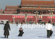 連續(xù)一周罕見(jiàn)的降雪后,北京天安門(mén)廣場(chǎng)管理部門(mén)刻意將廣場(chǎng)上的皚皚白雪保留,以便游客、特別是南國(guó)熱帶地區(qū)的游人欣賞拍攝雪景。如果北京的氣溫持續(xù)保持目前的低溫,天安門(mén)廣場(chǎng)的雪景可以保留十天左右。作者:任晨鳴