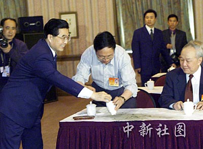國家副主席胡錦濤在“兩會(huì)”期間看望參會(huì)的全國政協(xié)委員時(shí),蔡義江委員不小心弄灑茶水,胡錦濤從自己桌上拿起毛巾幫他擦拭。作者:滿會(huì)喬