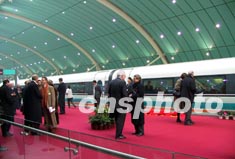 圖為中德兩國(guó)總理在龍陽(yáng)路車站為上海磁浮列車通車剪彩。