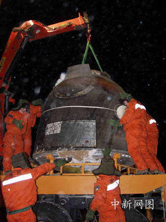 返回艙在內(nèi)蒙古草原著陸后,被吊裝入專(zhuān)用卡車(chē)沿公路運(yùn)往北京。孫陽(yáng) 攝