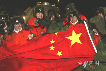 2003年1月5日,返回艙成功著陸,著陸場內(nèi)一片歡騰景象。孫陽 攝
