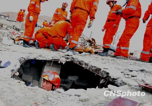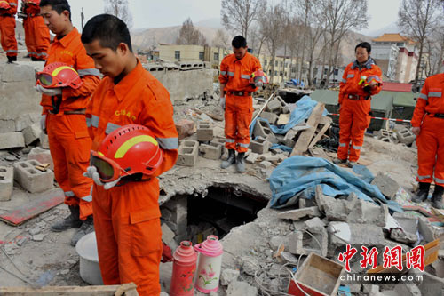 地震救援隊(duì)在玉樹地震災(zāi)區(qū)廢墟上默哀