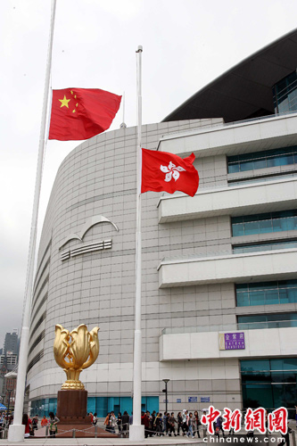 圖:香港金紫荊廣場(chǎng)下半旗致哀
