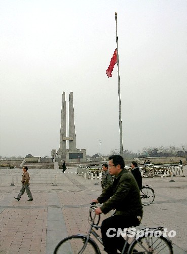 河北唐山抗震紀(jì)念碑廣場(chǎng)下半旗志哀