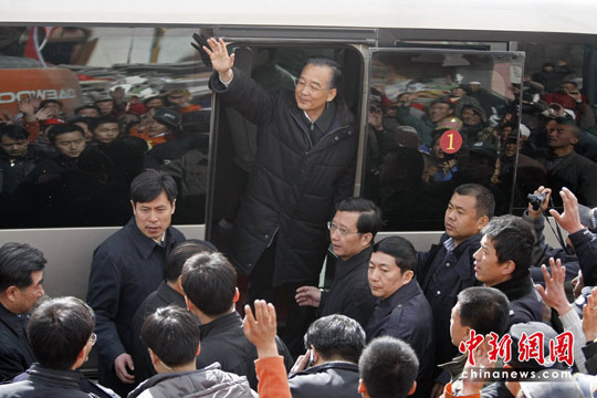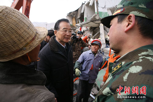 溫家寶玉樹災(zāi)區(qū)救援現(xiàn)場(chǎng)問(wèn)候消防官兵