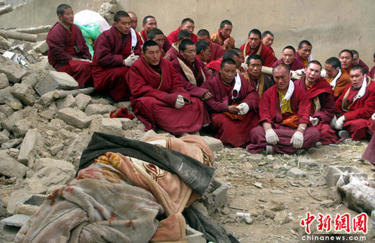 玉樹遇難者遺體火葬 僧侶為逝者祈禱