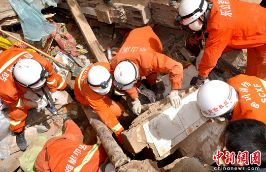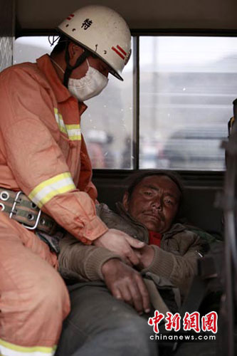 圖:西藏消防總隊(duì)在玉樹地震現(xiàn)場(chǎng)救援