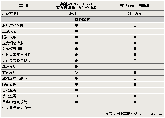 在舒適配置方面,入門的寶馬120i可能會(huì)讓你失望,常見(jiàn)的真皮座椅以及自動(dòng)空調(diào)在這款“純運(yùn)動(dòng)”的車型身上均找不到。而相比之下奧迪A3 Sportback首發(fā)限量版就顯得更豪華了,這款新車裝配了部分奧迪原廠的“S-Line”運(yùn)動(dòng)套件,不僅視覺(jué)效果更運(yùn)動(dòng),配置也提升了一個(gè)檔次。