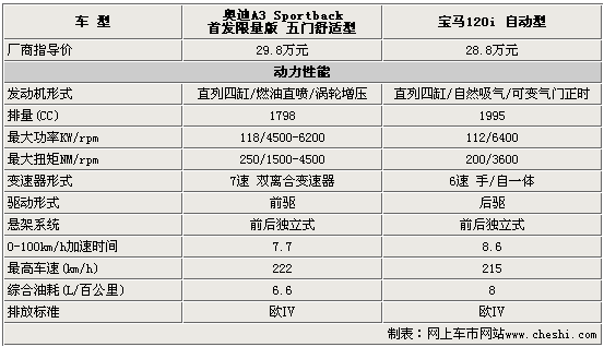 兩款車型的定位均為豪華運(yùn)動(dòng)型轎車,在性能方面自然互不相讓。通過(guò)上表我們可以清楚的看到,奧迪A3 Sportback首發(fā)限量版在性能上超越了寶馬120i,而寶馬120i憑借車身前后50:50的配重贏在了操控性上。奧迪A3 Sportback首發(fā)限量版搭載了7速雙離合變速器,這種變速器能更好的發(fā)揮發(fā)動(dòng)機(jī)的性能,體積更輕并且比手動(dòng)擋車型更省油。
