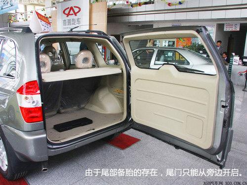 瑞虎的整體造型更偏重時尚,U型鍍鉻進氣格柵,氣勢比較平和,顯得比較秀氣;車身側(cè)面的時尚車貼,加強了幾分動感;而掛在車門上的備胎才能真正的透露出瑞虎的一絲野性,不過由于備胎的存在,尾門只能從旁邊開啟。