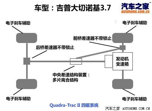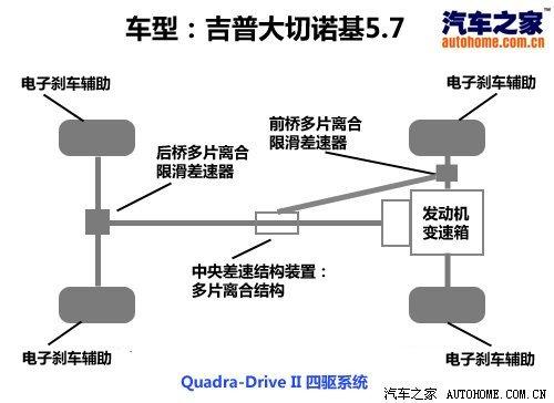 大切諾基采用前后整體橋的非獨(dú)立懸掛,這在結(jié)構(gòu)在本身上也偏重越野。進(jìn)入國內(nèi)的大切諾基有兩款車型,排量分別為3.7升和5.7升,兩款車型采用的四驅(qū)結(jié)構(gòu)并不相同,主要體現(xiàn)在3.7升車型前后軸上沒有差速鎖,盡管它的電子輔助系統(tǒng)也足夠強(qiáng)大,但在通過一些難度較大的交叉軸項(xiàng)目時(shí),電子輔助還是比機(jī)械結(jié)合反應(yīng)緩慢一些。