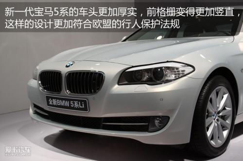 從前臉看,新一代寶馬5系的車頭更加厚實,前格柵變得更加豎直,這樣的設(shè)計更加符合歐盟的行人保護法規(guī),前格柵的設(shè)計更加接近7系,但與7系相比,格柵的變得更加修長。另外新5系發(fā)動機蓋上有兩條隆起的折線一直向?qū)汃R的車標(biāo)收縮,更加動感。