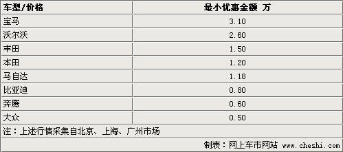 根據(jù)網(wǎng)上車(chē)市網(wǎng)站價(jià)格監(jiān)測(cè)系統(tǒng)顯示,以來(lái)自北京、上海、廣州三地城市為代表的上述8個(gè)熱銷(xiāo)品牌都出現(xiàn)了較大幅度的讓利優(yōu)惠。而另一方面國(guó)內(nèi)上半年的汽車(chē)生產(chǎn)量已經(jīng)超過(guò)800萬(wàn)臺(tái),國(guó)內(nèi)各大汽車(chē)交易市場(chǎng)和4S經(jīng)銷(xiāo)商處都出現(xiàn)了“庫(kù)存壓力”的報(bào)告。其中不乏BMW、沃爾沃這樣的高端品牌,而其它品牌多以大眾化品牌居多,它們當(dāng)中最小優(yōu)惠金額也在5000元以上至3.1萬(wàn)元之間。