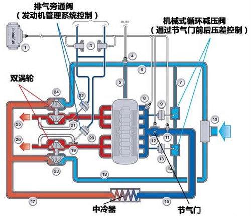 低轉(zhuǎn)速或者怠速的時候,排氣旁通閥完全關(guān)閉,所有的廢氣通過兩個輕質(zhì)小渦輪,獲得最大的增壓效果,提高低轉(zhuǎn)速下油門響應(yīng)性以及動力輸出;在發(fā)動機滿負(fù)荷的情況下,通過部分打開排氣旁通閥以獲得一個比較恒定的增壓壓力,不增加耗油量。