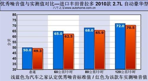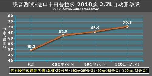 舒適性是普拉多的強項,日常行駛時的噪音能夠明顯感覺到是非常低的,這一點在之后的測試中得到了驗證。我們在一條平直無車的高速公路上測得普拉多的噪音值為:怠速49.3分貝;60公里/小時62.5分貝;80公里/小時65.9分貝;120公里/小時70.5分貝。