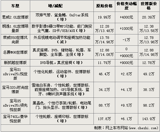 不同品牌共推出9款世博版車型,范圍從自主到進(jìn)口,從緊湊級到頂級豪華車,體現(xiàn)出世博這一世界人類盛會的巨大影響力。車型全部采用增加或較少配置的做法進(jìn)行改款,最高價格漲幅達(dá)到了9.5萬,降價車型只有一款,降幅為1萬。