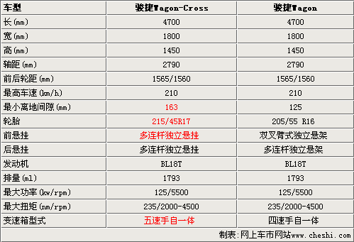 新駿捷WagonCross與駿捷Wagon的車身尺寸基本沒有變化,長寬高分別是4700/1800/1450毫米,軸距和前后輪距也沒有變化。但新駿捷WagonCross加大了離地間隙,達到了163毫米。另外,新駿捷WagonCross配備的是17英寸輪胎,而駿捷Wagon則配備16英寸輪胎。新駿捷WagonCross采用前后多連桿式設(shè)計,駿捷Wagon則采用雙叉臂式獨立懸架。在動力方面,這兩款車并沒有太大差別,只不過新駿捷WagonCross采用五速手自一體變速器,比老款駿捷Wagon有很大提高。