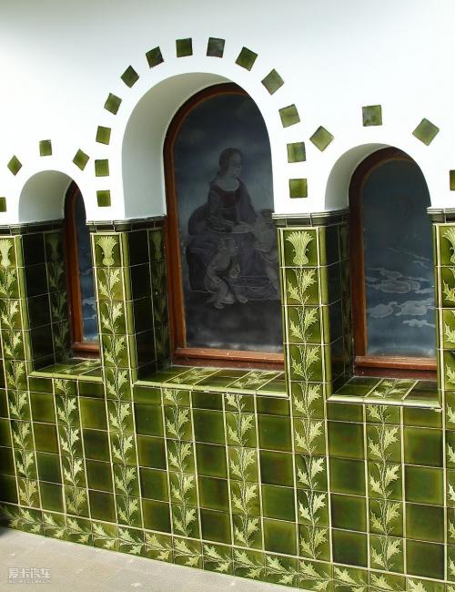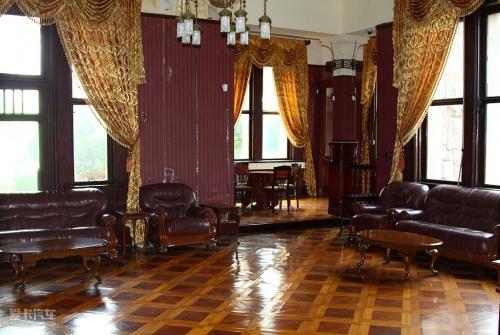 樓內(nèi)裝飾陳設異常華麗:銅制燈具、彩瓷鑲嵌壁爐依然光亮如新、雕花的天花板造型各異。