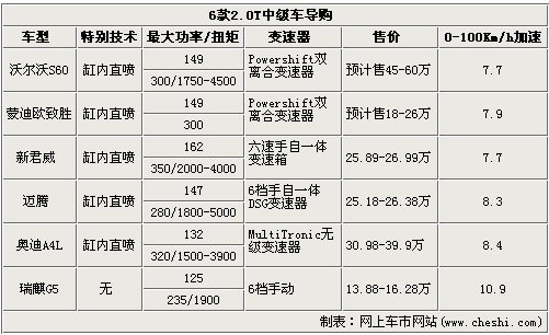 我們看到上述6款車中,有5款發(fā)動機是采用缸內(nèi)直噴技術(shù),三款采用了雙離合變速器,只有來自自主的瑞麒G5要遜色很多,不過價格方面的優(yōu)勢是明顯的。在功率、扭矩方面,新君威優(yōu)勢明顯,體現(xiàn)在0-100Km/h加速上也是僅7.7秒,與年底上市的沃爾沃S60相當。而蒙迪歐致勝考慮到沃爾沃與福特的關(guān)系,至少從參數(shù)上看與S60的2.0T發(fā)動機很可能是同一款。