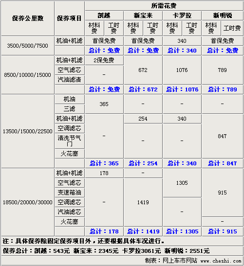 別克新凱越首保時(shí)間是四款車型中最短的,但廠家提供前兩次免費(fèi)保養(yǎng),這點(diǎn)看來(lái)還比較貼心。18500公里結(jié)算后,543元的總保養(yǎng)金額是四款車中最少的一個(gè)。新寶來(lái)和新明銳同為大眾品牌下車型,但由于合作商不同,保養(yǎng)的費(fèi)用還是存在一些細(xì)微的差距,都在2600元范圍內(nèi)。日系車一貫是經(jīng)濟(jì)實(shí)惠見(jiàn)長(zhǎng),但在后期保養(yǎng)的方面豐田卡羅拉的費(fèi)用卻是四款車中最高的,超過(guò)3000元的數(shù)字也是新凱越保養(yǎng)費(fèi)用的5倍多。