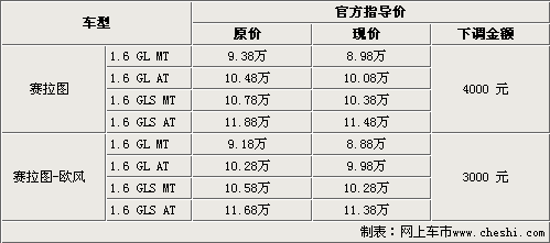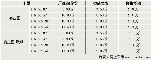 在調(diào)整完售價(jià)后,賽拉圖及賽拉圖歐風(fēng)GL低配車型的售價(jià)均降到了9萬元以下,完全進(jìn)入了自主車型的售價(jià)區(qū)間。同時(shí)頂配車型的售價(jià)最高也不過11.5萬。與此同時(shí)更具網(wǎng)上車市價(jià)格監(jiān)測(cè)系統(tǒng)顯示,在廠家下調(diào)完售價(jià)后,賽拉圖及賽拉圖歐風(fēng)仍有很大的價(jià)格浮動(dòng),最高優(yōu)惠金額高達(dá)1.68萬。具體車型售價(jià)見下表: