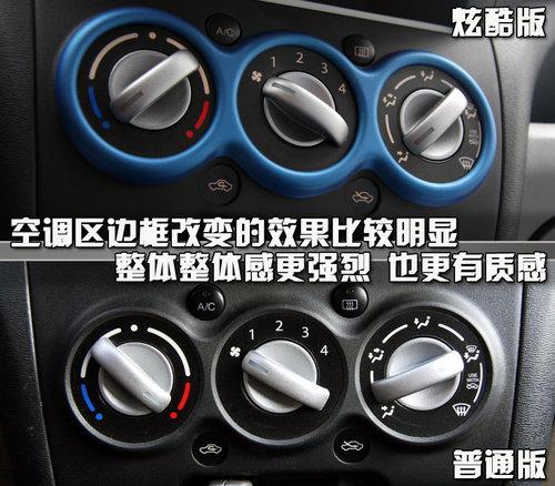 接著是中控臺(tái)主操作區(qū),有些朋友可能在中控臺(tái)整體圖上看到了音頻區(qū)似乎發(fā)生了一些變化,不要急,我們最后再說這一項(xiàng)驚天的改變。首先我們先來看空調(diào)區(qū)的三個(gè)圓形旋鈕,看過老款設(shè)計(jì)之后,我們可以看出三個(gè)旋鈕的整體感并不強(qiáng),雖然做了凹凸的設(shè)計(jì),但是質(zhì)感還是不夠。炫酷版就不一樣了,雖然也只是加了藍(lán)色邊框,但是完全將三個(gè)旋鈕串聯(lián)起來,并且十分清晰。