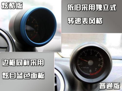 接著是大家普遍都十分欣賞的轉(zhuǎn)速表,了解新奧拓的朋友都知道,新奧拓沒有墨守陳規(guī)的將轉(zhuǎn)速表和車速表放在一起,也沒有使用電子式顯示。獨(dú)立的轉(zhuǎn)速表恐怕我們也就只有在一些性能車或改裝車上才能看到。這個(gè)設(shè)計(jì)本就已經(jīng)為新奧拓加分不少,炫酷版將外緣邊框部位也做了處理,藍(lán)色的邊框看起來比之前更加律動(dòng)。